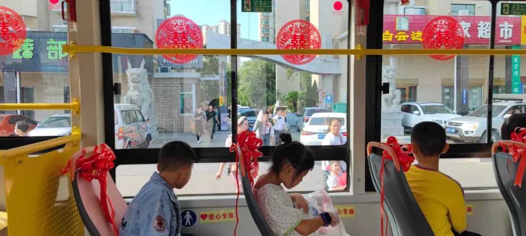 車窗貼著象征愛情的“囍”字剪紙