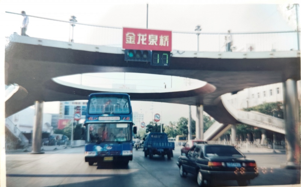 ▲00年代初,荊門市象山大道街景(金龍泉橋)。荊門市首輛雙層巴士與首座天橋同框。