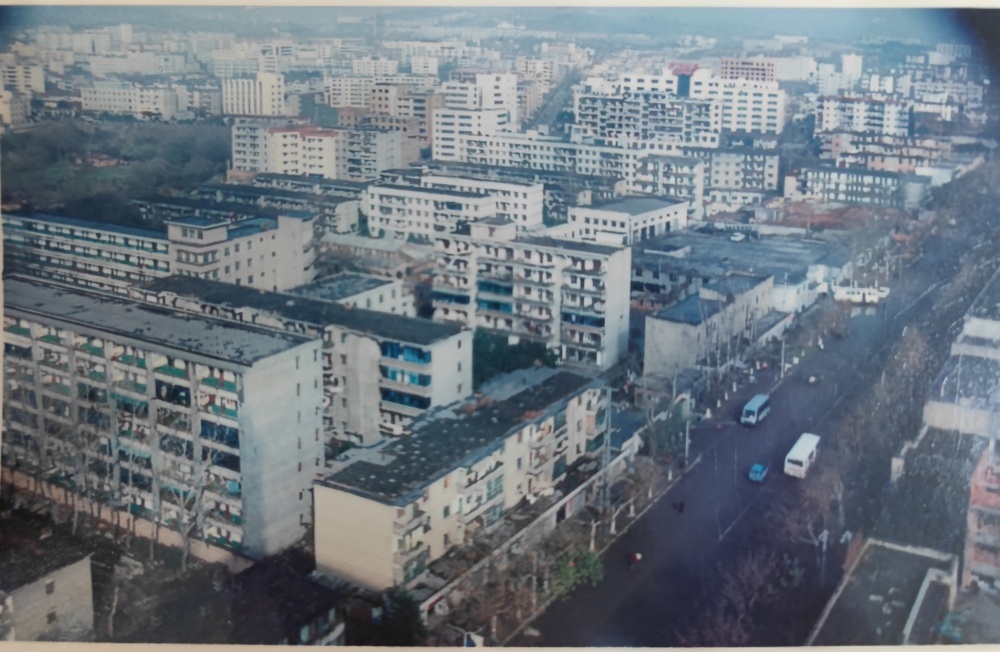▲80年代末,荊門市長寧大道街景圖。荊門公交集團總公司(舊址)位于長寧大道西側。當年總公司院內建有辦公樓、停車場、機修車間、機加車間、油庫、倉庫。