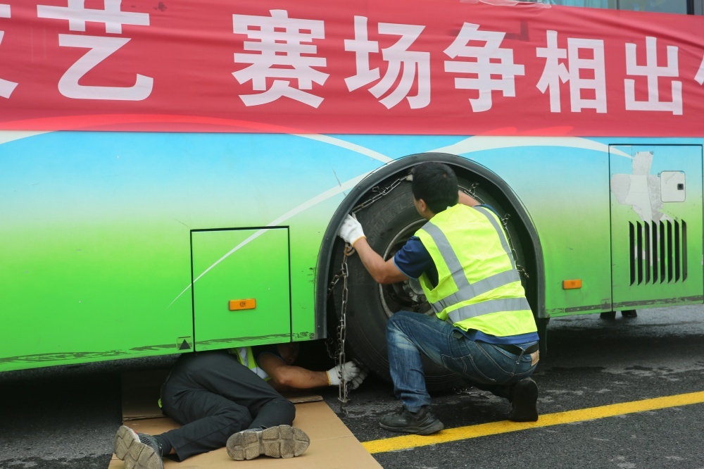 在安裝防滑鏈項目比武現(xiàn)場,市公交集團汽修公司員工王剛、劉小備兩人準備充分、配合默契——先由一人進入車底檢查車況,一人拿出防滑鏈等待安裝。很快,車況檢查結束,兩人迅速將防滑鏈套上輪胎,并將防滑鏈上的橡皮繩捆扎成規(guī)則五角形,經(jīng)檢查內(nèi)外側松度并無明顯松垮現(xiàn)象后,以3分09秒的成績結束比賽。