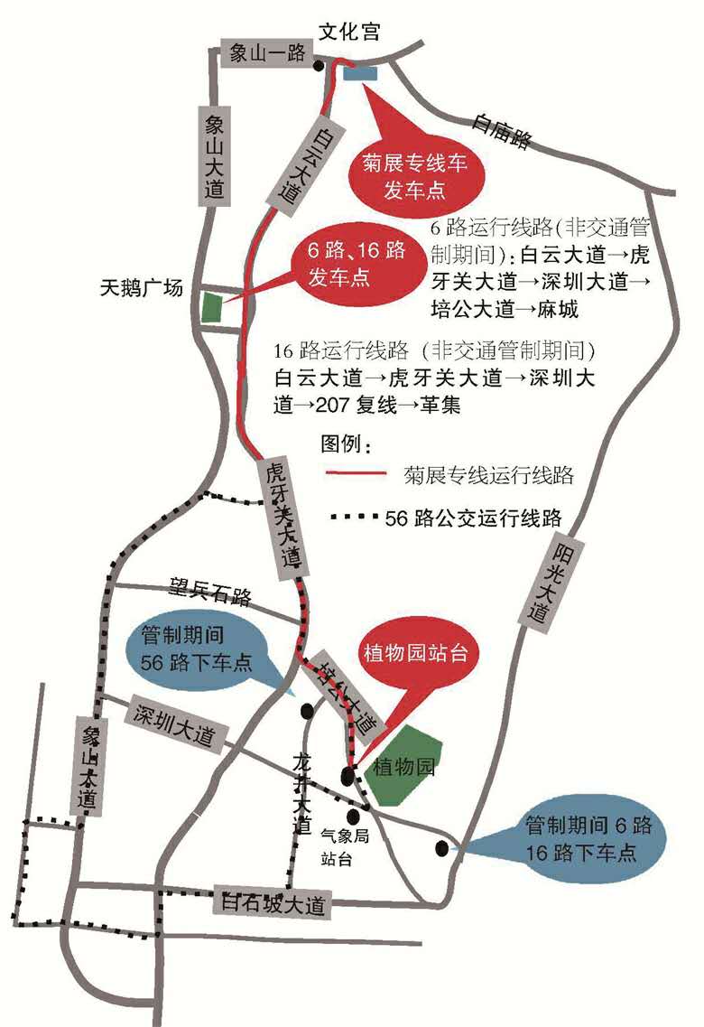 值得說明的是,菊展期間,公交按現(xiàn)行票價收費。菊展前三天,深圳大道東端、培公大道(培公大道與龍井大道交叉路口至培公大道與白石坡大道交叉路口)將實現(xiàn)交通管制,禁止公交車通行,這樣一來,上述四條公交在植物園附近的線路和??空军c將同步調(diào)整,菊展專線公交車將??吭谂喙蟮乐参飯@出口,其他時間??吭谥参飯@大門附近的植物園站臺。交通管制期間,16路公交車、6路公交車將??吭诎资麓蟮罇|上下車。56路交通管制期間線路不延伸,在培公大道與龍井大道交叉路口上龍井大道,游客可在龍井大道北段上下。荊門晚報訊(記者戴永君)