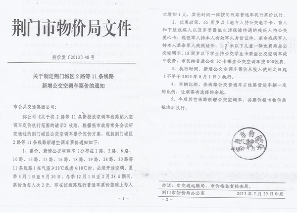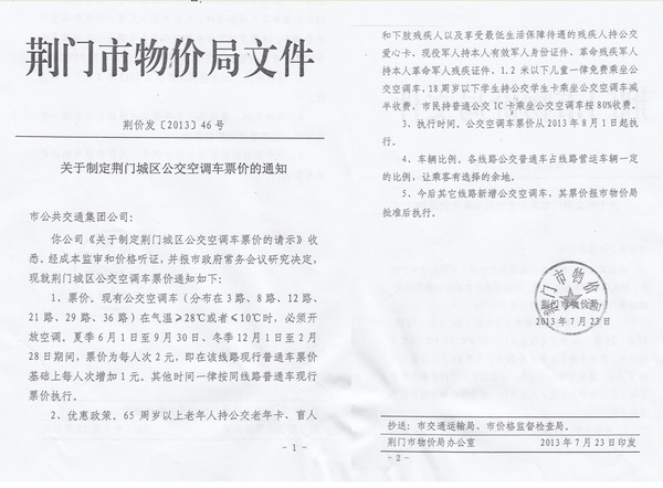根據(jù)荊門市物價(jià)局《關(guān)于制定荊門城區(qū)公交空調(diào)車票價(jià)的通知》(荊價(jià)發(fā)[2013]46號(hào))及《關(guān)于制定荊門城區(qū)2路等11條線路新增公交空調(diào)車票價(jià)的通知》(荊價(jià)發(fā)[2013]48號(hào)),公交空調(diào)車2014年6月1日至9月30日營(yíng)運(yùn)時(shí)段內(nèi)執(zhí)行2元/人次票價(jià),現(xiàn)就執(zhí)行公交空調(diào)車票價(jià)后的有關(guān)事項(xiàng)公告如下: