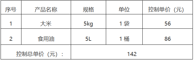 預(yù)算金額:本次詢價(jià)對(duì)大米、食用油的單價(jià)、合計(jì)總單價(jià)進(jìn)行詢價(jià),在各分類報(bào)價(jià)不超過(guò)控制單價(jià)(含稅)的前提下,控制總單價(jià)142元,超過(guò)此采購(gòu)預(yù)算的報(bào)價(jià)無(wú)效。